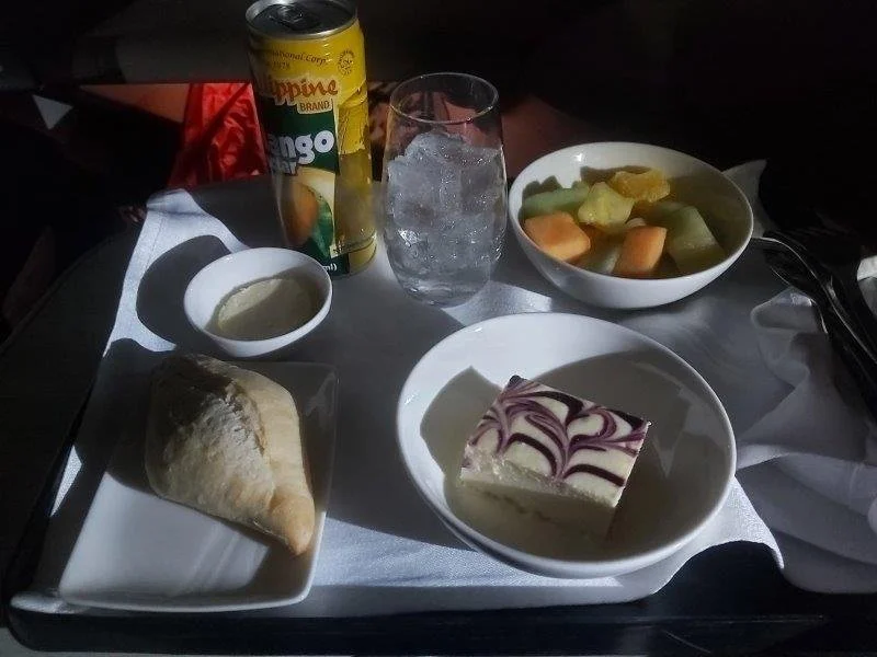 After the first meal I was able to get 2 hours of sleep. This will turn out to be the only sleep from Wednesday morning in Canada to when I arrived Friday afternoon in the Philippines. The chair is a full lie flat so that is not an issue, but maybe the excitement of travel, or the change in routine kept me awake. They kept provided water and snacks throughout the flight. I accepted an apple and they offered a snack set that I had a little later. There was more items offered than I took, but I was not very hungry so I just took some healthier options and the blueberry cheesecake.